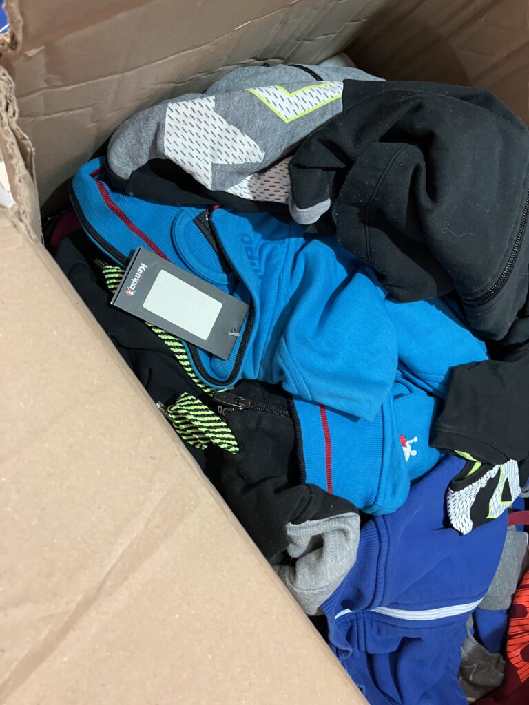 Dort angekommen wird es von mir übernommen, doch weil sofort klar war, dass es fast 20kg Inhalt waren, brauchte ich eine zweite Kiste. Wer hilft? Clemens Döttl und Mario Simlinger, die gerade eine Dressenlieferung für ein anderes Projekt bekommen haben. So kann dank der vielen Spenden gleich nächste Woche eine weitere Kiste versendet werden.