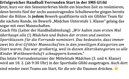 Der nächste Termin ist dann der 18. 2., wenn die Mädchen der 3. und 4. Klassen ab etwa 09:30 Uhr erneut in der Sporthalle Gföhl eine Vorrunde spielen werden.