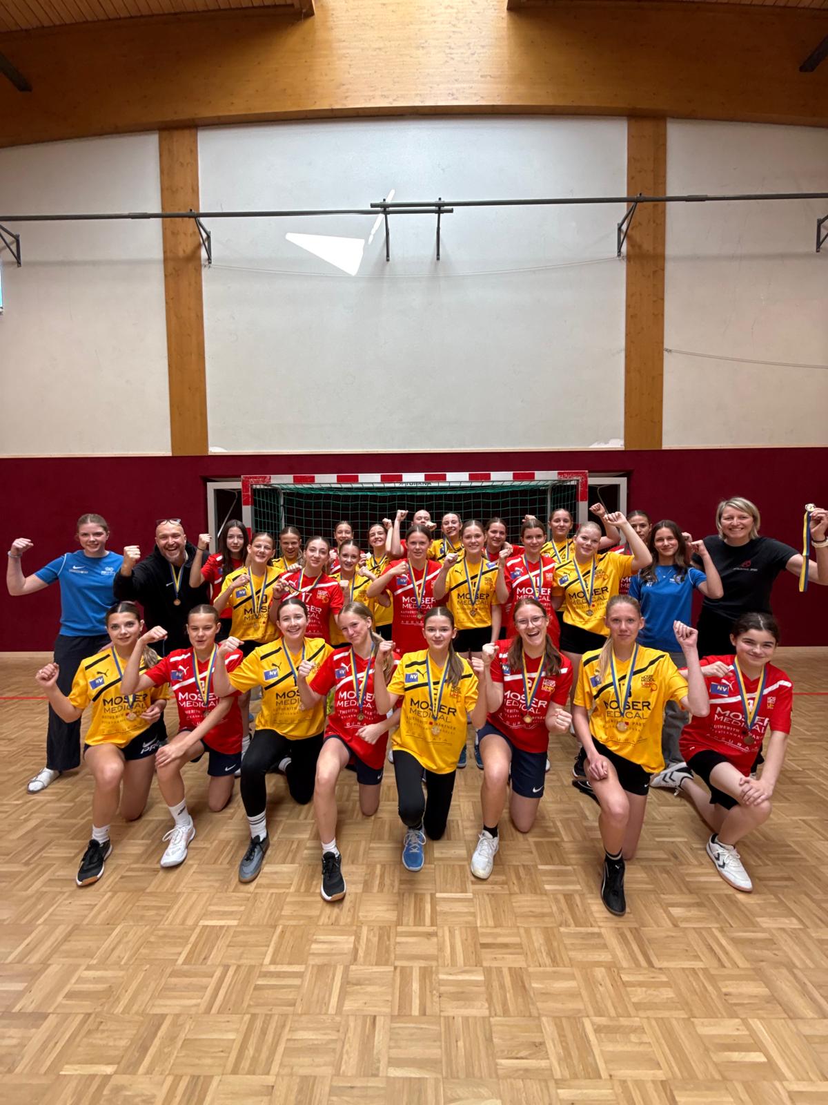 In zwei Alterskategorien konnten wir uns in diesem Schuljahr gleich mit zwei Teams für das Finalturnier qualifizieren. So durften am 23. 4. 2026 gleich 20 Mädchen beim Turnier in Maria Enzersdorf mitspielen, was wertvolle Spielpraxis gegen richtig starke Teams bedeutete. Dadurch, dass das Match gegeneinander mit einem Remis endete, entschied das bessere Torverhältnis für das Team „rot“, dicht gefolgt vom Team „gelb“.